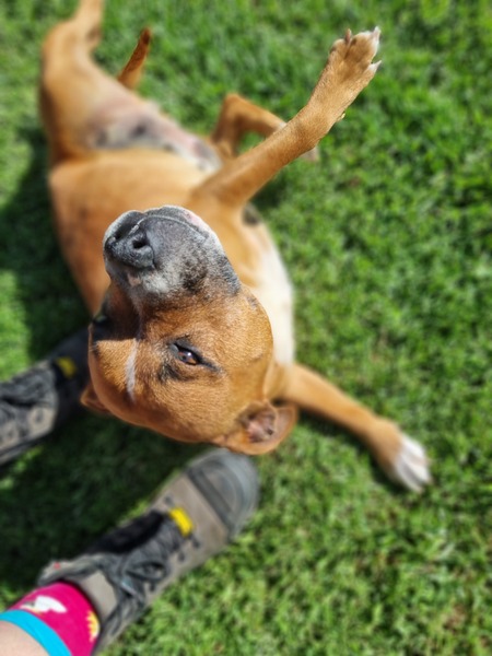 Rosie is a sweet, affectionate older girl with a playful sparkle and a heart full of love. She adores people and truly wants to be part of the family - whether that means rolling over for belly rubs or attempting to curl up in your lap like the big cuddle bug she is.