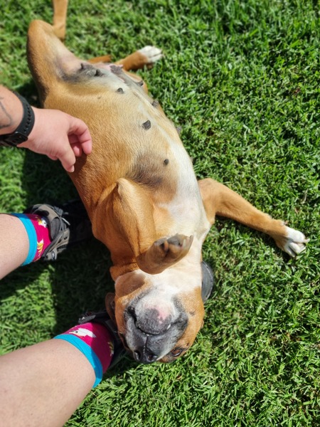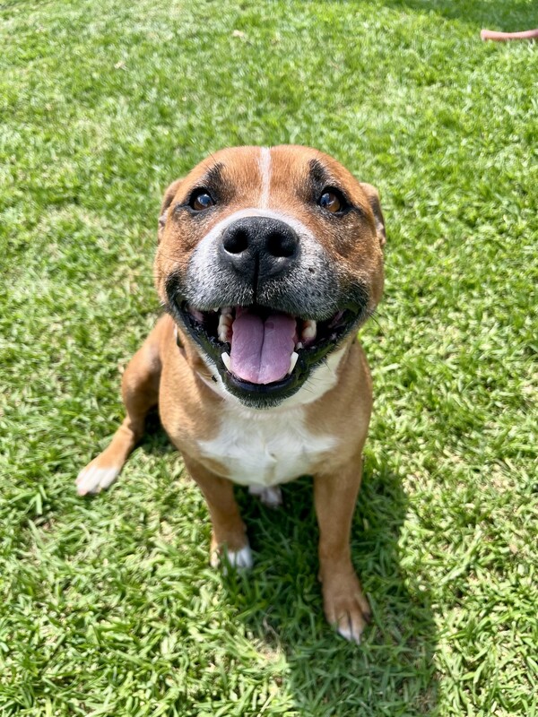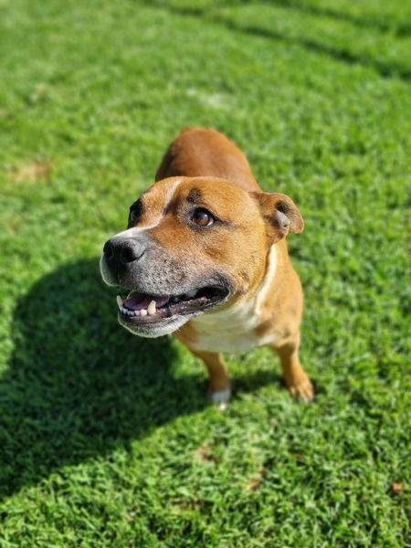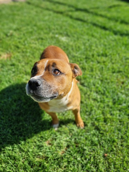 Rosie enjoys being indoors with her people and will happily travel along for car rides. Outside time may need supervision, as she can be curious about wildlife. She can get excited at times and may jump up, so a home with older, steady children would be ideal - though families familiar with Staffy personalities may be a good match too.