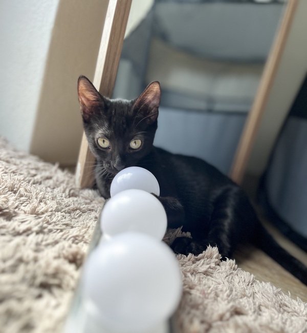 and I'm the little black whirlwind you've been waiting to meet! I'm a sleek all‑black girl with endless energy-I play hard, run fast, and can turn just about anything into a toy. If you're looking for a kitten who brings life, laughter, and a whole lot of zoomies into your home, I'm your girl.