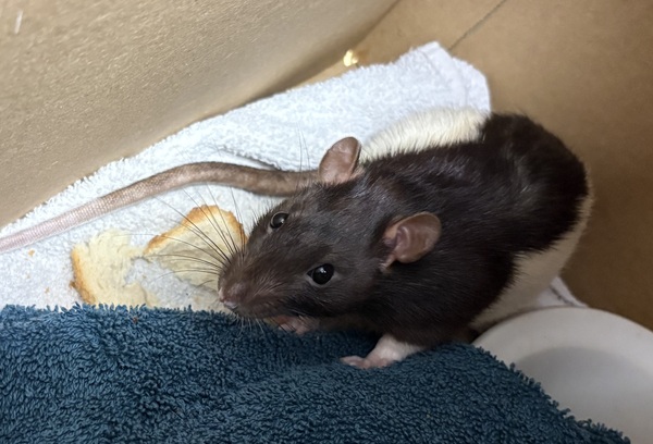 Meet Mudcake. Did you know that rats make great, interactive pets? Like any animal, the more positive human interaction they experience, the more comfortable they will be around us. Although rats don't need long walks like dogs, or giant scratching towers around the house like cats, they still require physical exercise and mental stimulation to keep them happy and healthy, just on a smaller scale. You can get creative with your tissue and cereal boxes to make fun new hidey holes and tunnels for your rat to explore. Twigs and branches also make great enrichment toys. Rats require a constant supply of high quality rodent mix as well as fresh fruit and veggies. So why don't you pop in an application to meet Mudcake.