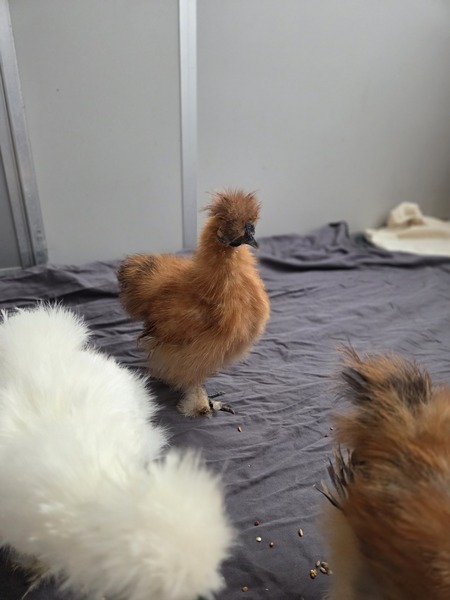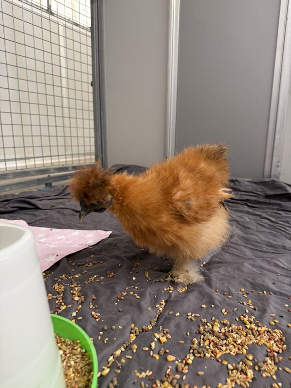 This lovely Silky, Fluffin, has likely had limited handling in the past, and as a result is still shy about being touched. While they'll confidently spend time near people in their pen and are happy to approach a hand offering grain or seed, they aren't comfortable with being picked up just yet and will quickly run off when an attempt is made.