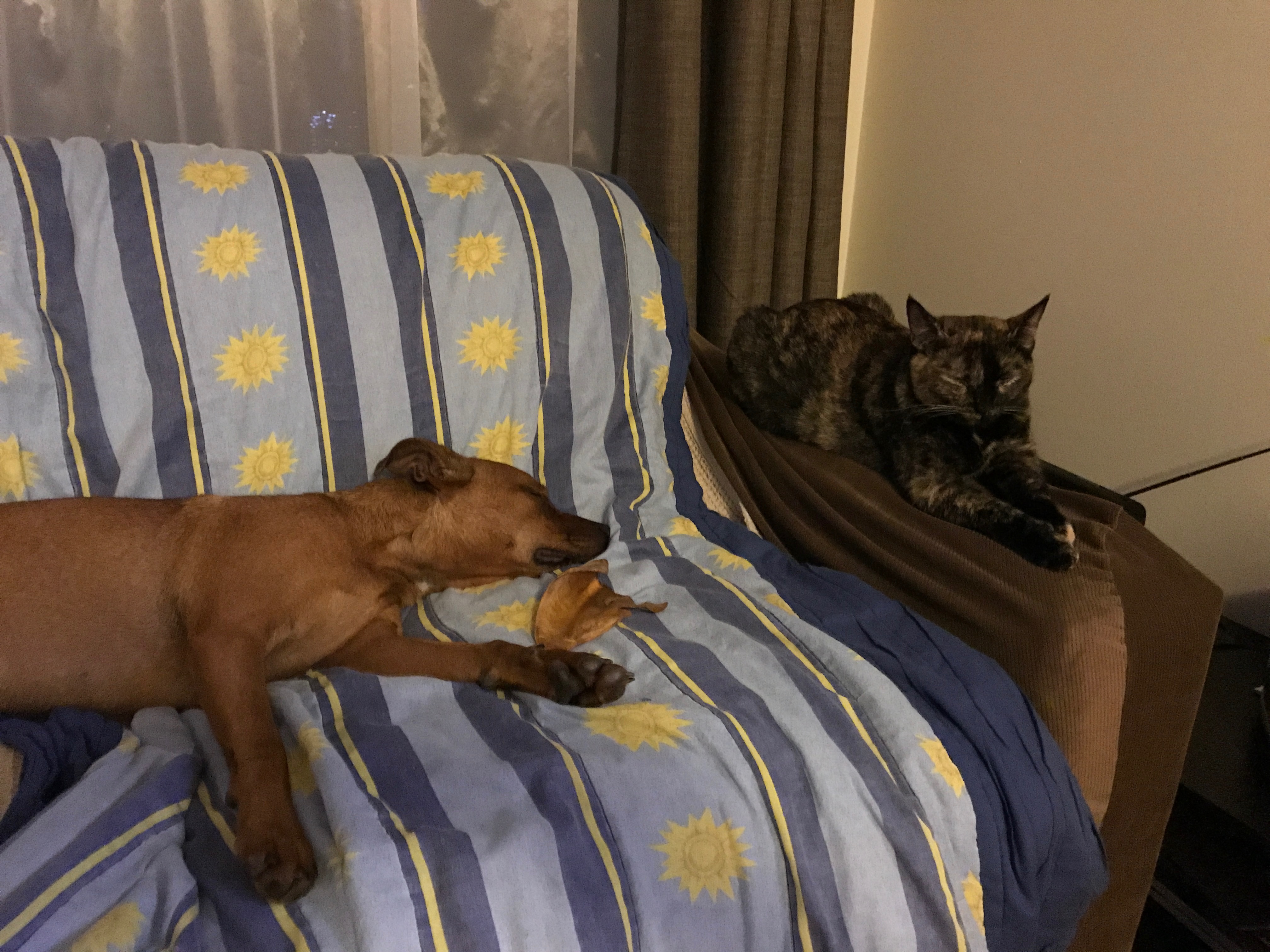 Boomer has adopted some of Starbucks style and vice versa. Their human parents often say they have a dog that thinks she is a cat and a cat that thinks she is a dog. The girls play well together and generally Boomer initiates play, during which she does her little kitty growl, and Starbuck’s tail wags the entire time.