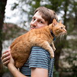Finally, their hard work pays off and the weighted net pulled the little owl to the ground, trapping him long enough for Jo to grab him and safely restrain him in a transport enclosure